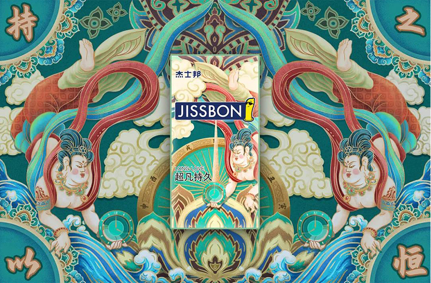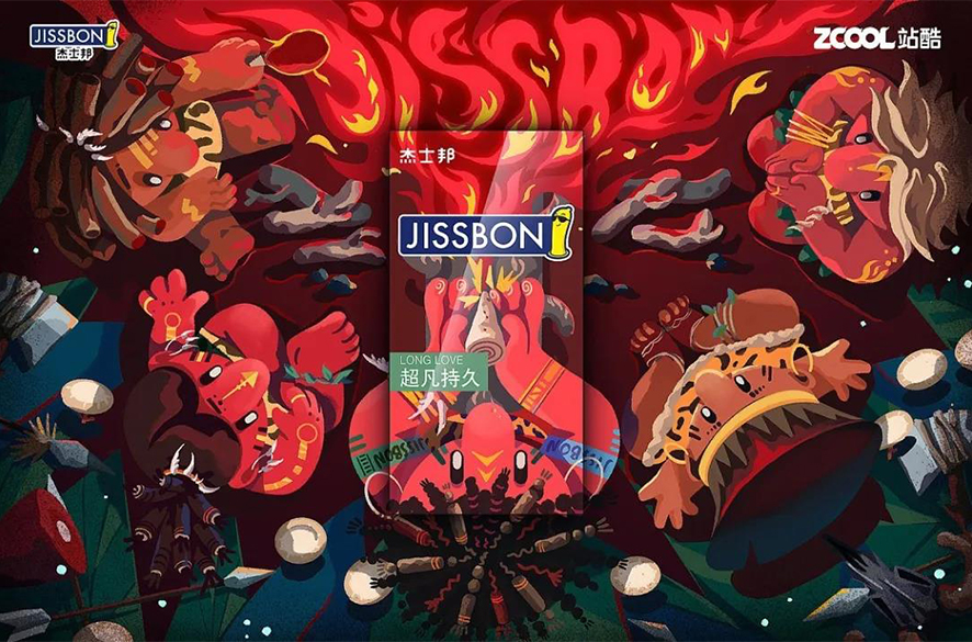 “钻木取火”的过程就是一个持久的坚持,够通过不断的动作才能最终产生热烈的火苗,“干柴烈火”与“钻木取火”的场景正好可以巧妙的结合,含蓄的表达了关于产品的核心特点“持久”。情爱的热烈之火也需要持久的坚持,才能够在最终一刻“点燃”,尝到最后的“果实”。画面中熊熊燃烧的火焰中是“jissbon”的字母,再一次表达持久的过程最终将获得持续热烈的体验。