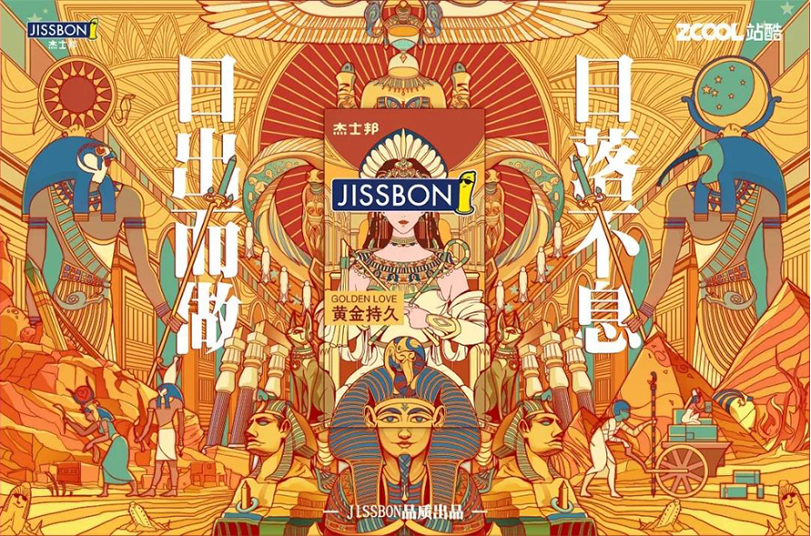 提到黄金持久,很多人都会想到那个由无数黄金宝石堆建起来的华丽国度,那就是历史悠久的古埃及。而提到古埃及,让人印象深刻的除了壮观的大金字塔和高耸的神像之外,还有那位倾国倾城的传奇女人,那就是埃及艳后——克利奥帕特拉七世。为了体现持久这一关键词,我先构思出了一个简单直接,同时又富有内涵的一个文案设计:日出而“做”,日落“不”息。将这个文案与古埃及的太阳神和月神相结合,配上一些充满内涵的元素细节,组成了一个华丽且神秘的视觉设计,引人无限联想。
