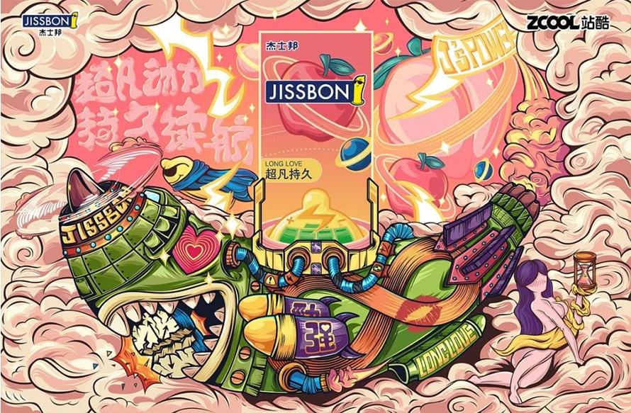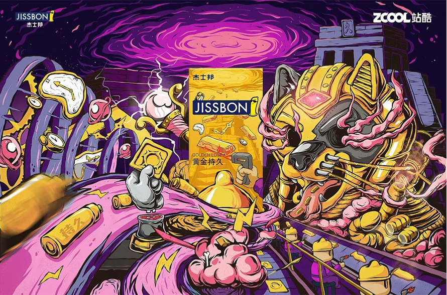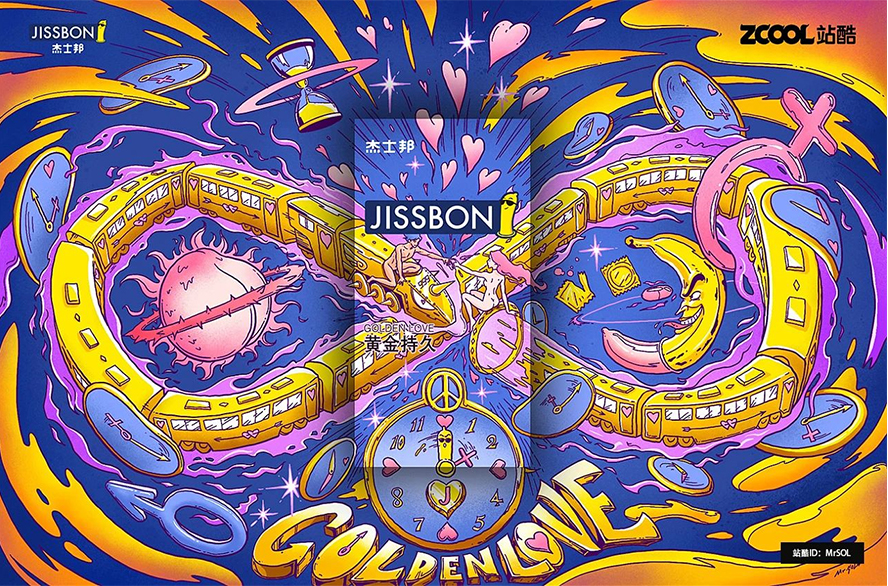 首先最直接联想到男女、情爱,列车入洞便以男女最原始的姿态作为插画作品之核心。黄金 — 给人一种坚硬的特质,以一列金色火车长而久的特点侧面描述持久。符号 — ∞ 「无穷」意表无穷无尽的强大持久力!谐音 — 黄金铁道999即象征着久久久。